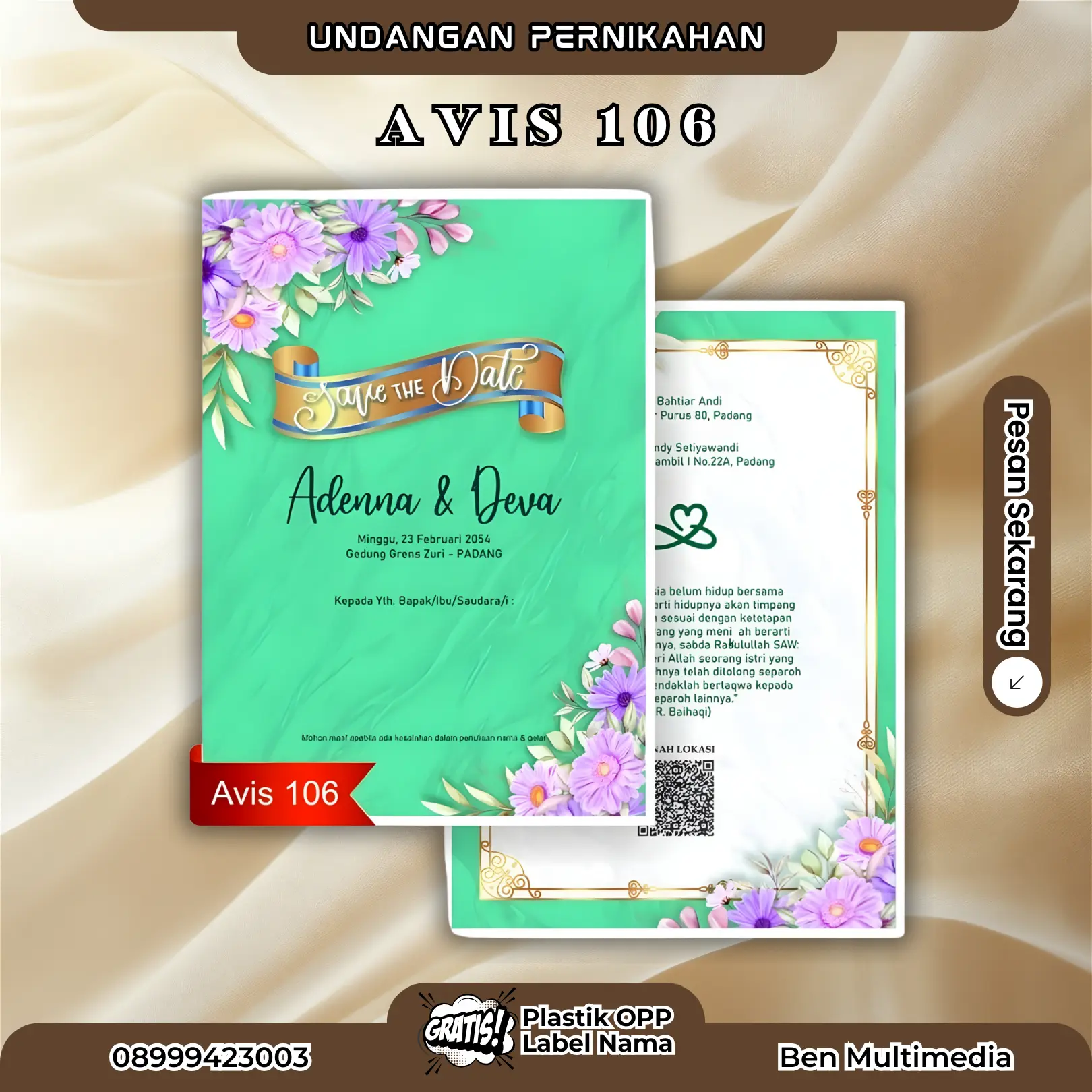 Cetak Blangko Pernikahan Avis 106 adalah solusi undangan elegan dengan harga hemat dari Ben Multimedia. Menggunakan Blangko Avis 106 berkualitas, dilengkapi bonus lengkap, serta layanan edit desain gratis, produk ini sangat cocok bagi calon pasangan pengantin yang mengutamakan kerapian dan kesederhanaan. Dengan spesifikasi detail dan kualitas cetak profesional, Avis 106 menjadi pilihan yang aman, praktis, dan memuaskan.