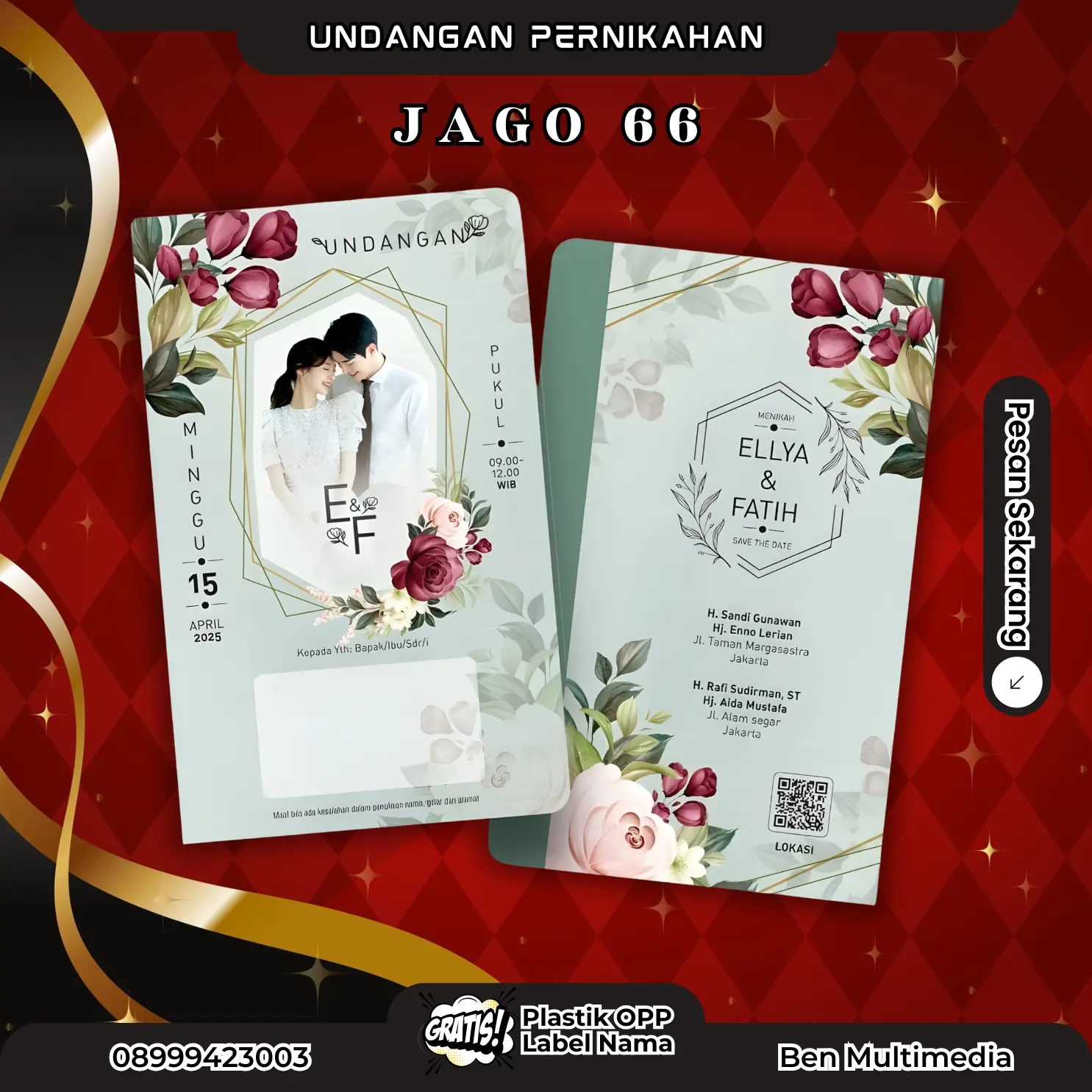 Akses Lokal: Bagi Anda yang berada di sekitar Surakarta, kami menyambut Anda di toko fisik kami di Jl. Kartika, RT.3/RW.22, Jebres, Kec. Jebres, Kota Surakarta, Jawa Tengah 57126 untuk melihat langsung sampel undangan Jago 66.
