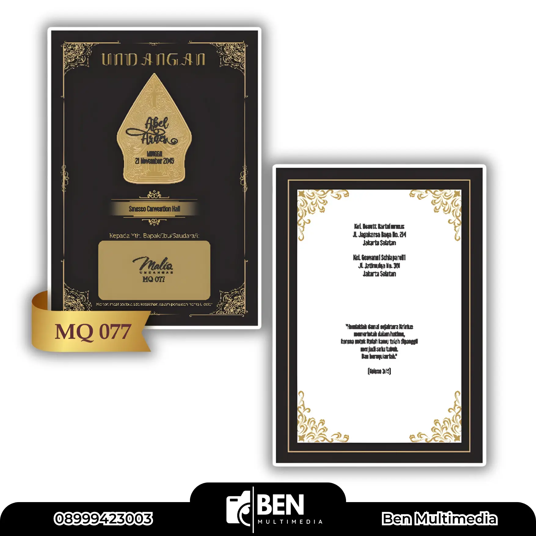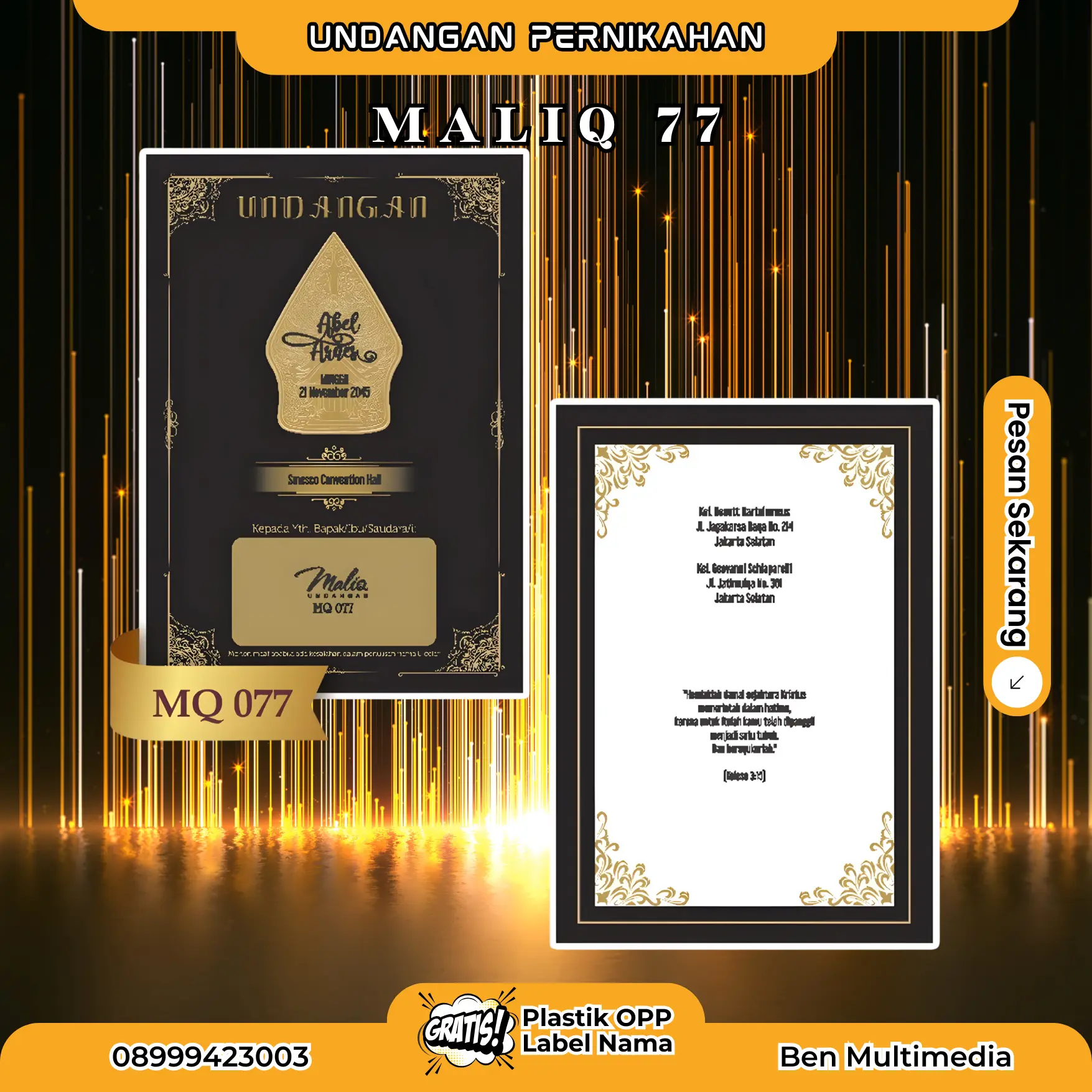 Karena itu, Ben Multimedia menghadirkan layanan Cetak Blangko Undangan Maliq 77 pilihan sempurna bagi Anda yang menginginkan undangan berdesain elegan, harga terjangkau, dan hasil cetak berkualitas tinggi.
