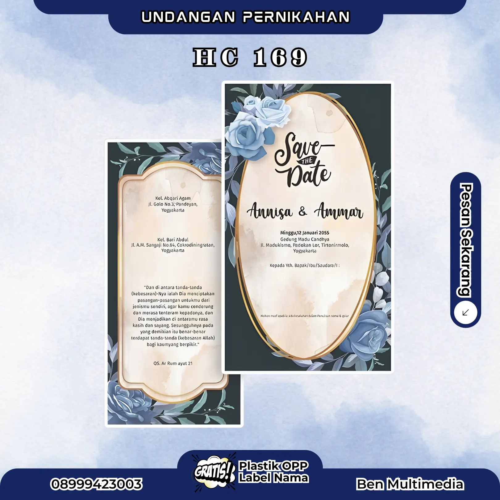 Dengan desain blangko HC 169 yang modern dan bahan berkualitas, undangan ini mampu menghadirkan kesan hangat dan profesional di hari istimewa Anda.