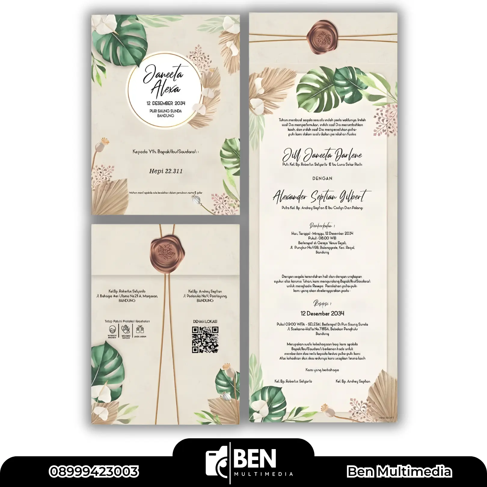 - Rekomendasi Isi: Data pengantin, keluarga inti, denah lokasi, barcode maps, dan foto kecil