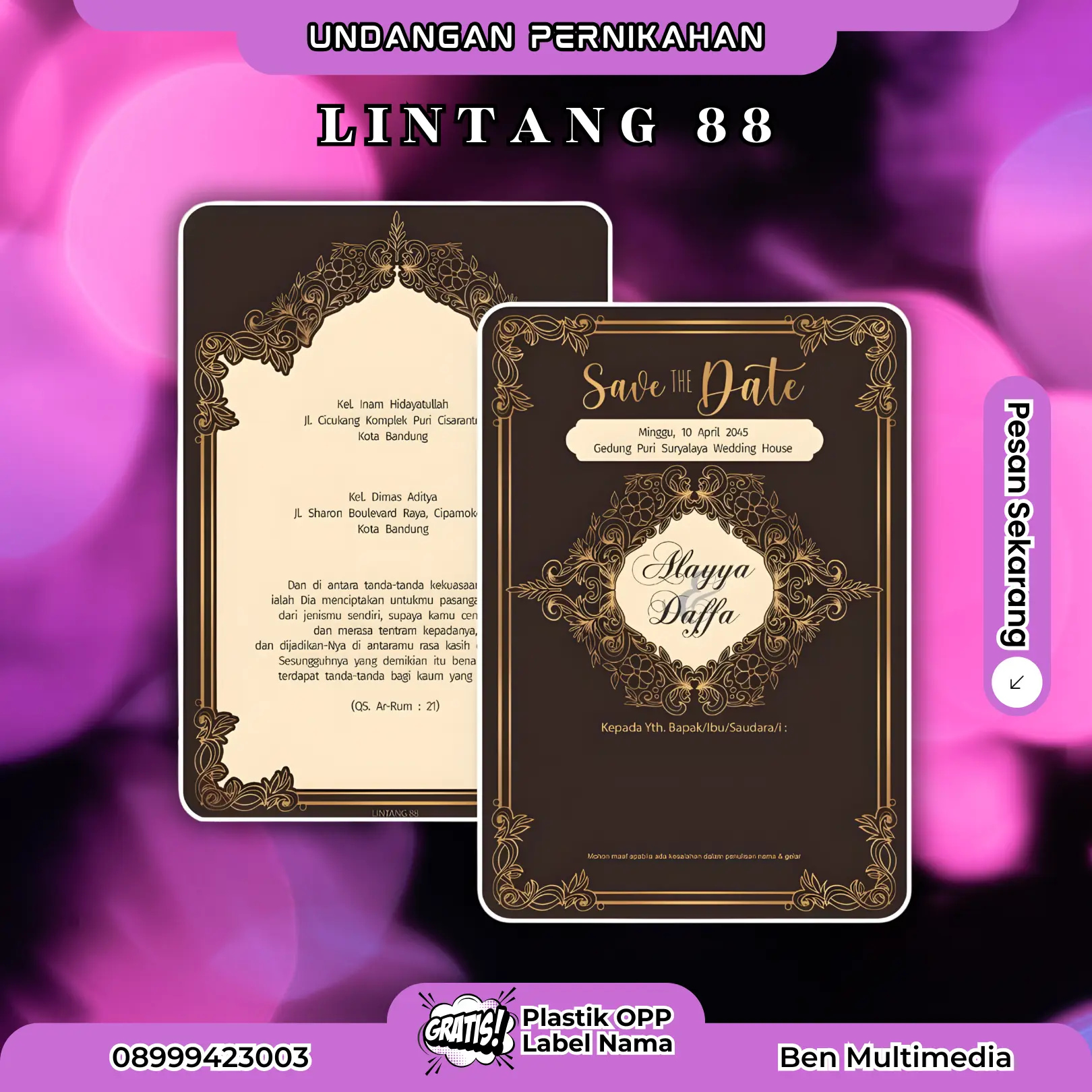 Ben Multimedia – Cetak Lintang 88 Blangko Undangan adalah pilihan tepat bagi calon pengantin yang menginginkan undangan praktis, ekonomis, namun tetap terlihat berkelas.