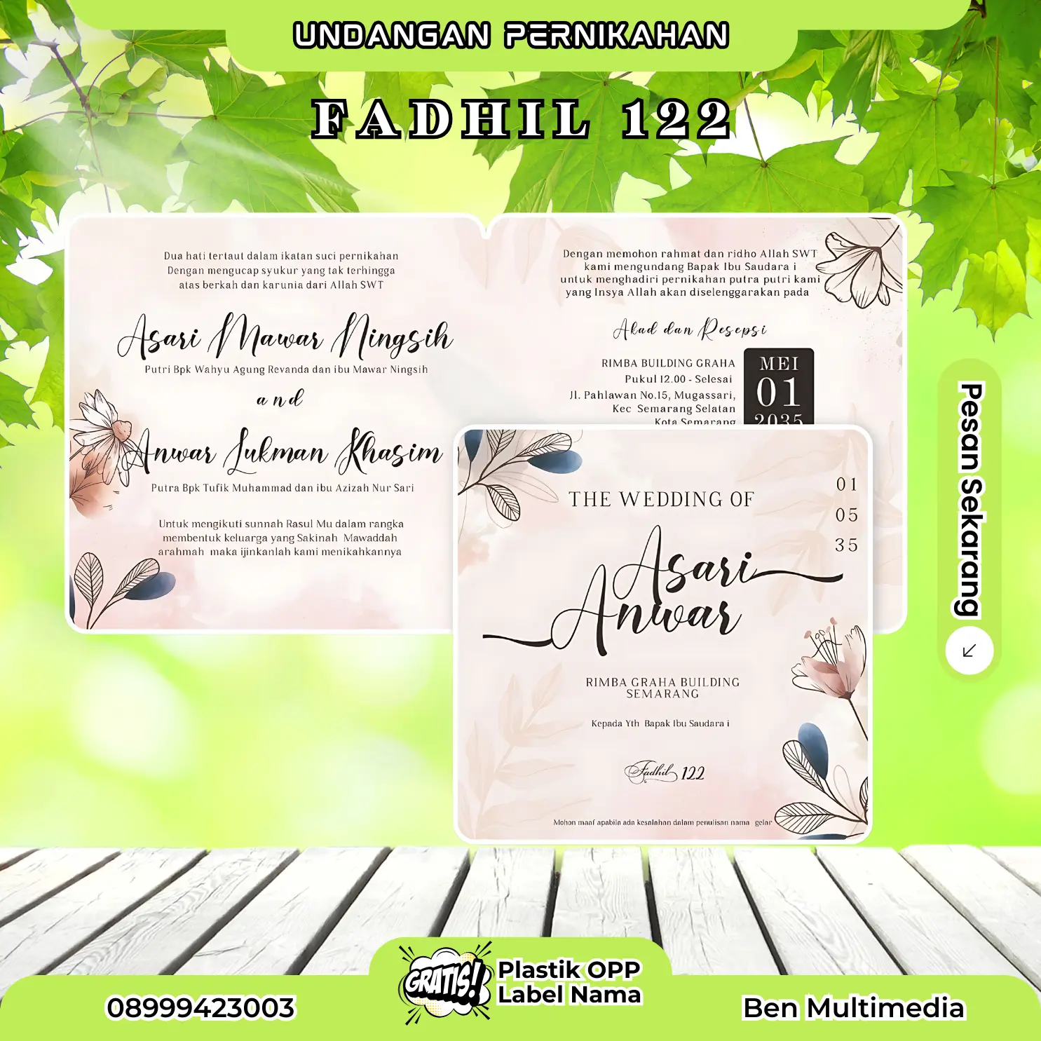 Dengan memilih Cetak Undangan Fadhil 122, Anda mendapatkan undangan softcover yang simpel namun tetap estetik, cocok untuk berbagai konsep acara mulai dari modern, minimalis, hingga tradisional.