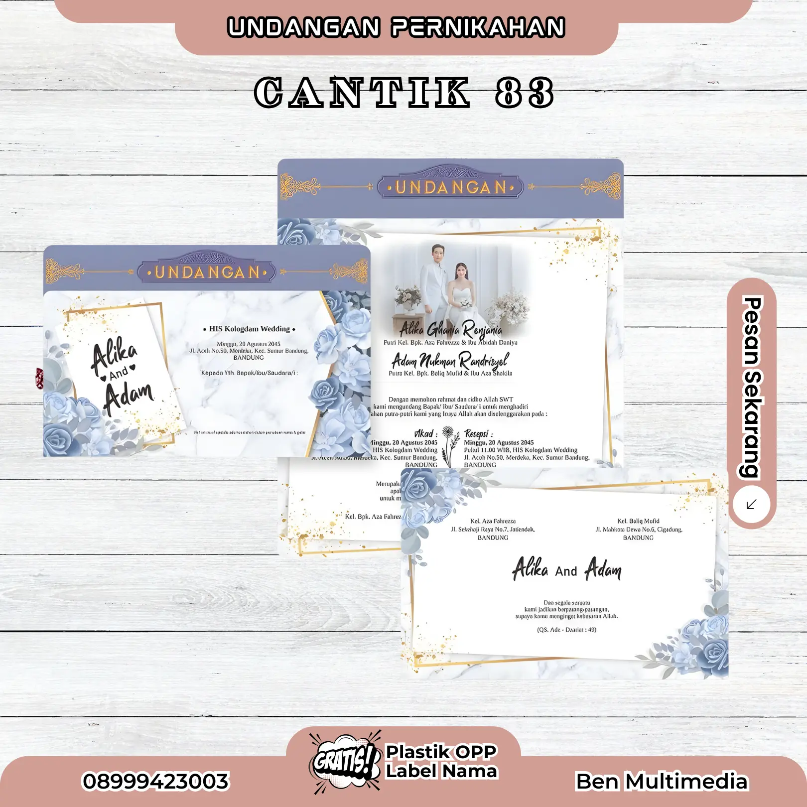 Jika Anda mencari undangan premium dengan harga ekonomis namun tetap terlihat mewah, maka undangan Cantik 83 adalah jawabannya.